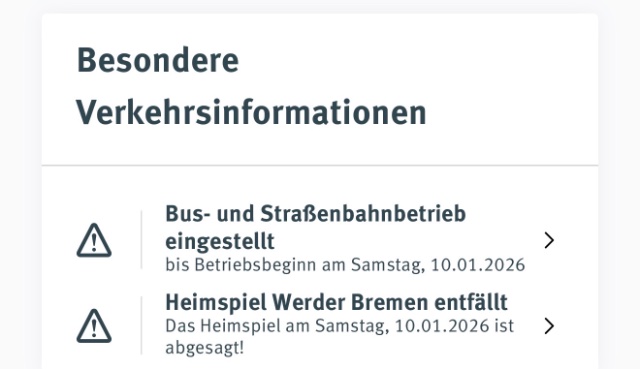 Der Lauftext auf der Startseite kommuniziert klar, dass sämtliche Buslinien bis auf Weiteres eingestellt sind. Der lässt sich nur nicht so schön screenshotten.Arne Schmidt hat geschrieben: ↑9. Januar 2026 13:24Man hätte auch gleich schreiben können, das auf allen Linien der Verkehr eingestellt wurde. Das ist für (ich schätze) 95% der Fahrgäste einfacher zu verstehen. (Bevor man versucht herauszufinden, welche Buslinie denn vielleicht doch noch fährt).